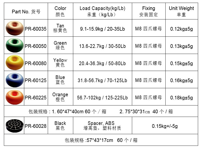 增高墊僅為黑色,可以與防震球搭配一起使用(如果木箱底部高度在叉車作業(yè)范圍,則無須使用增高墊)。
