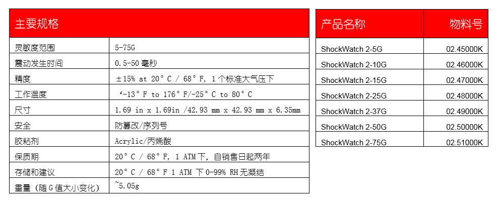 ShockWatch 2沖擊指示器顯示出產(chǎn)品何時(shí)在運(yùn)輸或儲(chǔ)存過程中發(fā)生沖擊震動(dòng)和破損,ShockWatch設(shè)備是防篡改、現(xiàn)場可攜帶、機(jī)械激活的設(shè)備,當(dāng)受到?jīng)_擊時(shí),它會(huì)變成鮮紅色。它們存在運(yùn)輸中防止了處理不當(dāng),并降低了相關(guān)損失的成本。